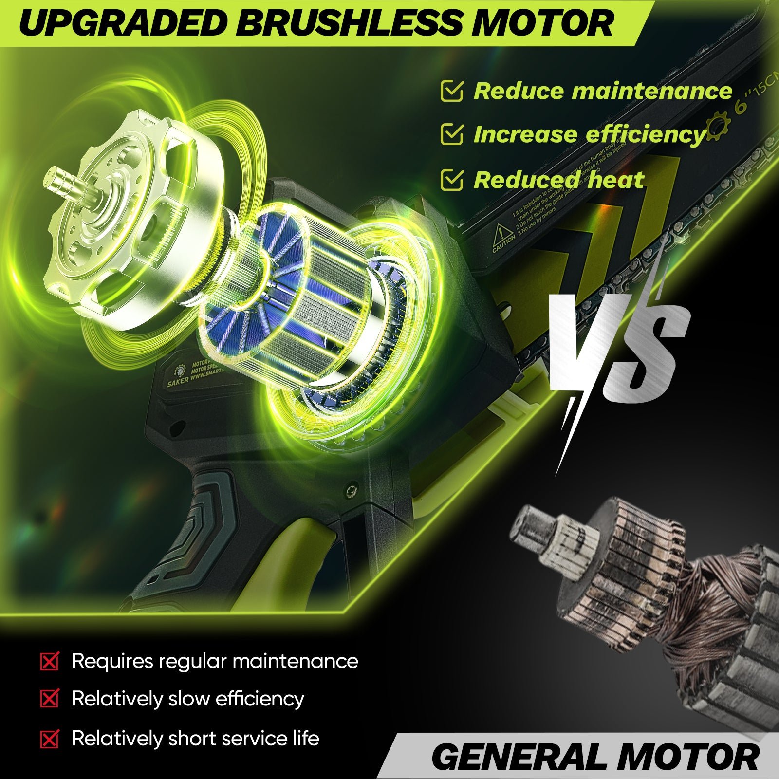 Newly Upgraded Brushless Motor: Equipped with a brushless 400W motor, Saker pole saw delivers enhanced cutting power with a chain speed of up to 26.25 ft/s. Enjoy 5 times longer service life, 30% increased power output, and 50% improved cutting efficiency, enhancing overall cutting efficiency.Compared to regular chain saws with brushed motors, Saker brushless 6-Inch long pole saw is more powerful and better suited to your trimming needs.